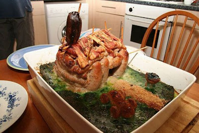 A house made out of sausages and bacon. Sounds delicious and it looks so.